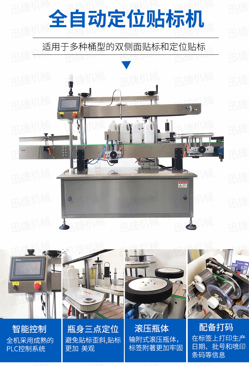 全自動貼標機采用微電腦-PLC-電子光纖傳感器控制系統,使整機運行穩定、高速、操作系統采用操作界面控制,操作簡便、實用、效率高,并有產量記數功能 速度快且穩定,適用范圍大,可用于各種尺寸的圓形瓶貼標輸附式滾壓瓶體,使標簽附著更加牢固 前后段可選連線使用。