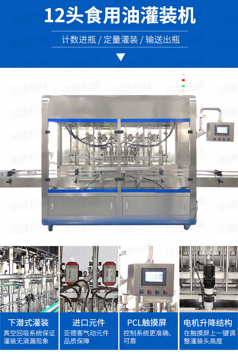 該系列玻璃瓶灌裝機采用容積式計量灌裝原理,適用于各種規(guī)(100ml-1000ml)的南瓜籽油、榛子油、牡丹籽油、芝麻油、核桃油、山茶油、亞麻籽油、棉籽油、橄欖油、大豆油、玉米油、菜籽油等食用油灌裝。設備采用伺服驅動活塞計量,保證了 1‰的灌裝精度,在保證灌裝精度的同時,提高了 20%-35%灌裝速度,操作簡單,維護方便,節(jié)省人工成本,生產效率更高。