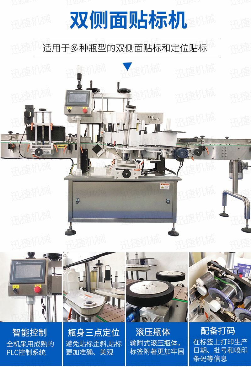 全機采用的技術,微電腦-PLC-電子光纖傳感器控制系統(tǒng),使整機運行穩(wěn)定、高速; 操作系統(tǒng)采用操作界面控制,操作簡便、實用、效率高,并有產量記數功能; 技術的速度快且穩(wěn)定; 適用范圍大,可用于各種尺寸的圓形瓶貼標; 輸附式滾壓瓶體,使標簽附著更加牢固; 前后段可選連線使用。