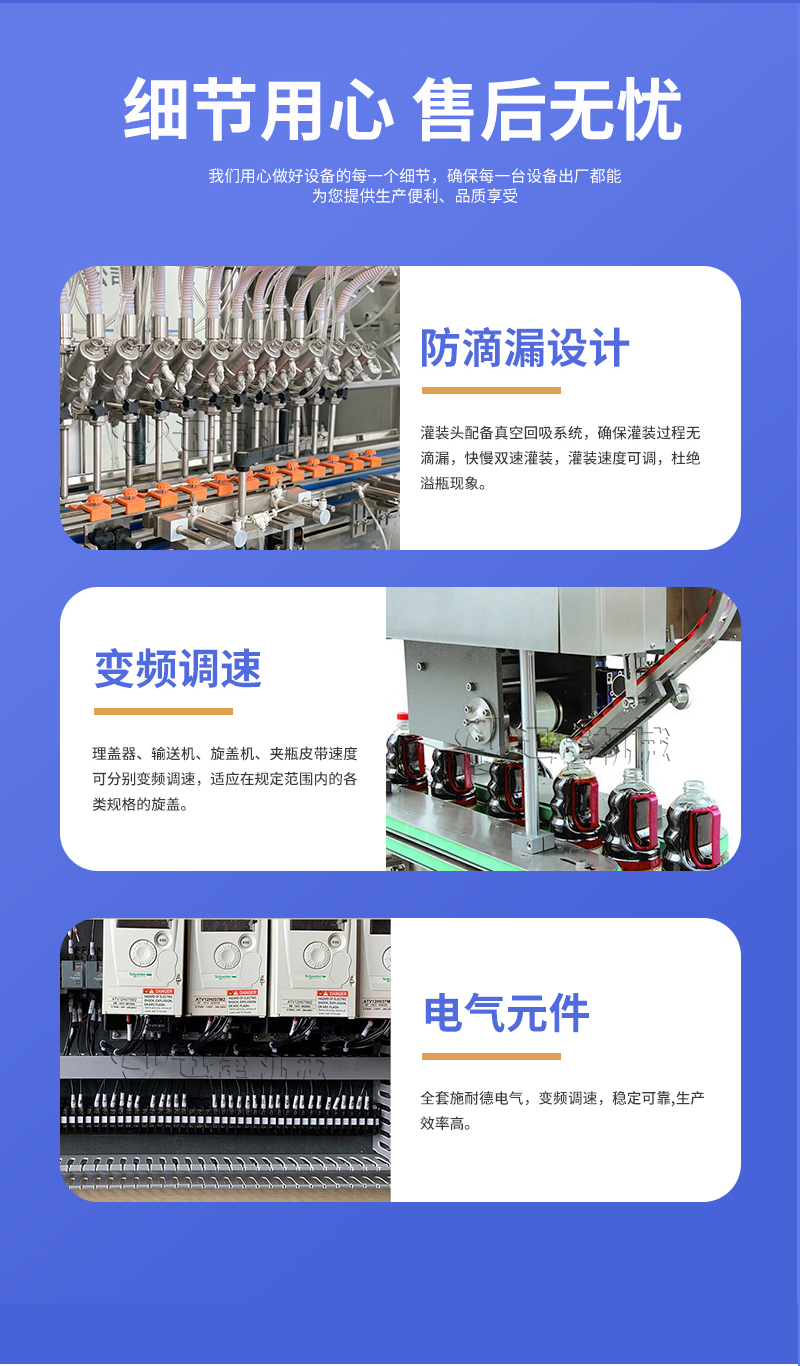 公司主要經(jīng)營(yíng)兩大類產(chǎn)品:灌裝機(jī)和包裝機(jī)。其中灌裝機(jī)主要產(chǎn)品有:食用油灌裝機(jī)、液體灌裝機(jī)、膏體灌裝機(jī)、自動(dòng)灌裝機(jī)、全自動(dòng)灌裝機(jī)、辣椒醬灌裝機(jī)等;包裝機(jī)產(chǎn)品有:粉劑包裝機(jī)、顆粒包裝機(jī)、液體包裝機(jī)、自動(dòng)包裝機(jī)、真空包裝機(jī)等。