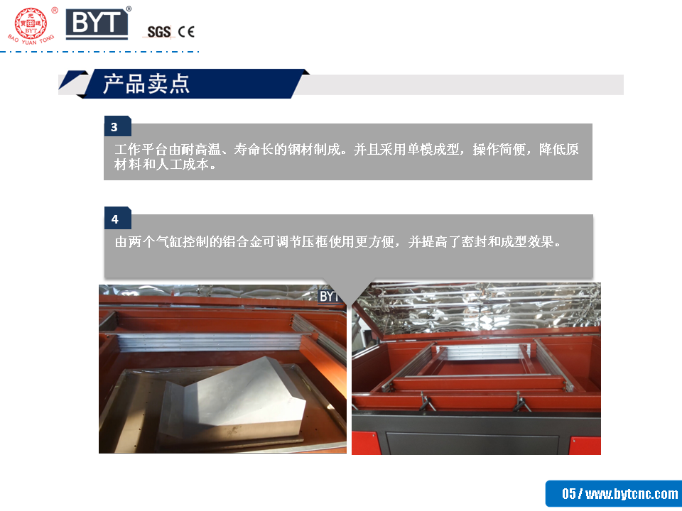 4.由兩個氣缸控制的鋁合金可調(diào)節(jié)壓框使用更方便,并提高了密封和成型效果。